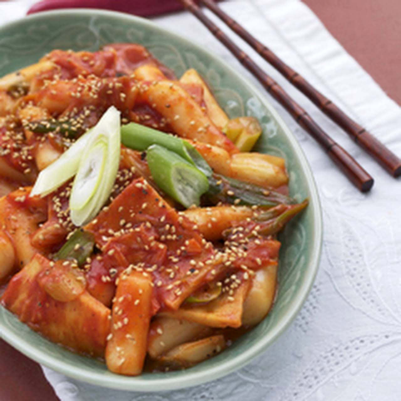 Spicy Korean Rice Cakes (tteokppoki) subsequently Water, Anchovies, Kelp, Rice Cakes, Chili Paste, Sugar, Fish Cakes, Cabbage, Leek, Garlic, Ketchup, Sesame Seeds, Pepper
